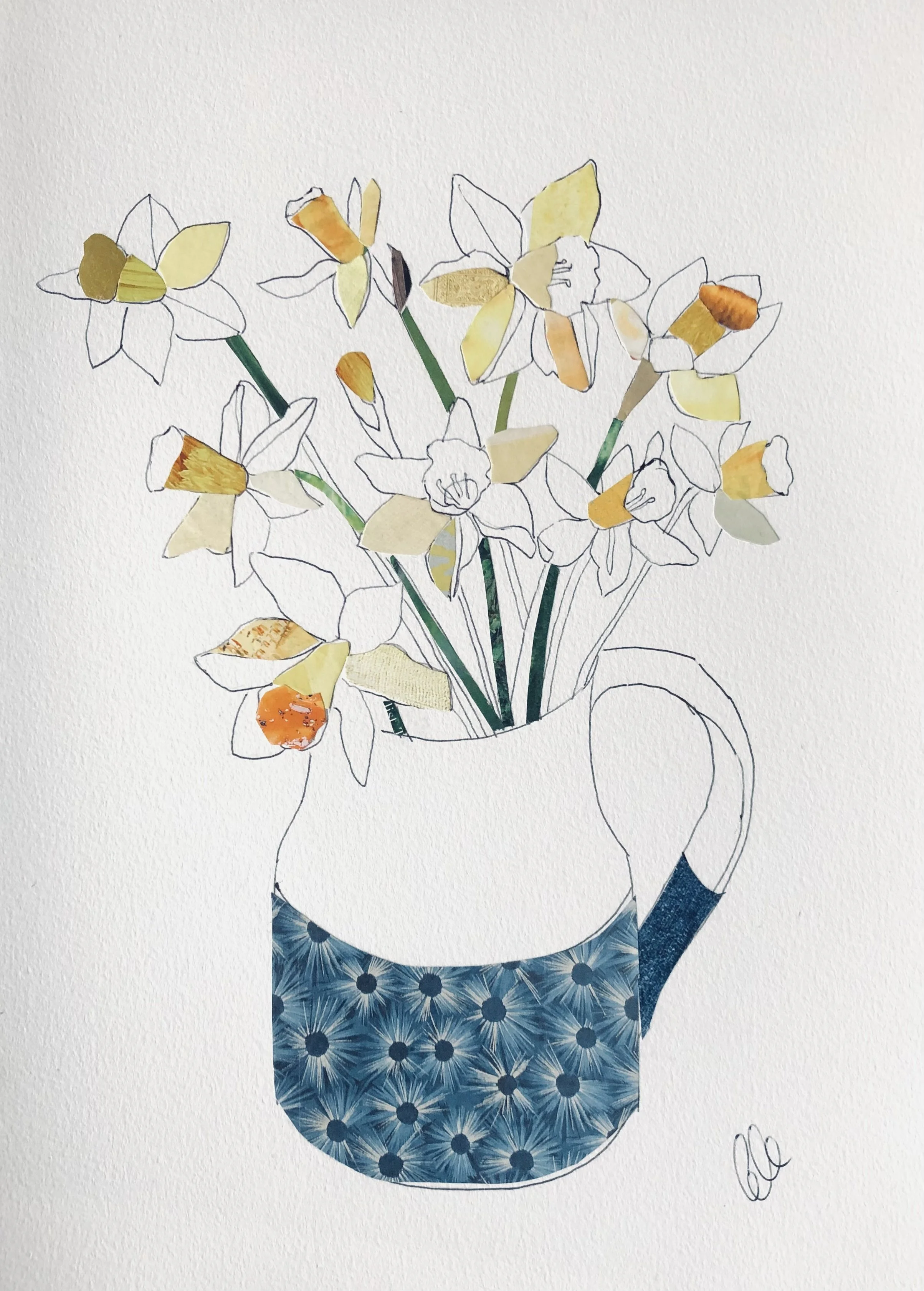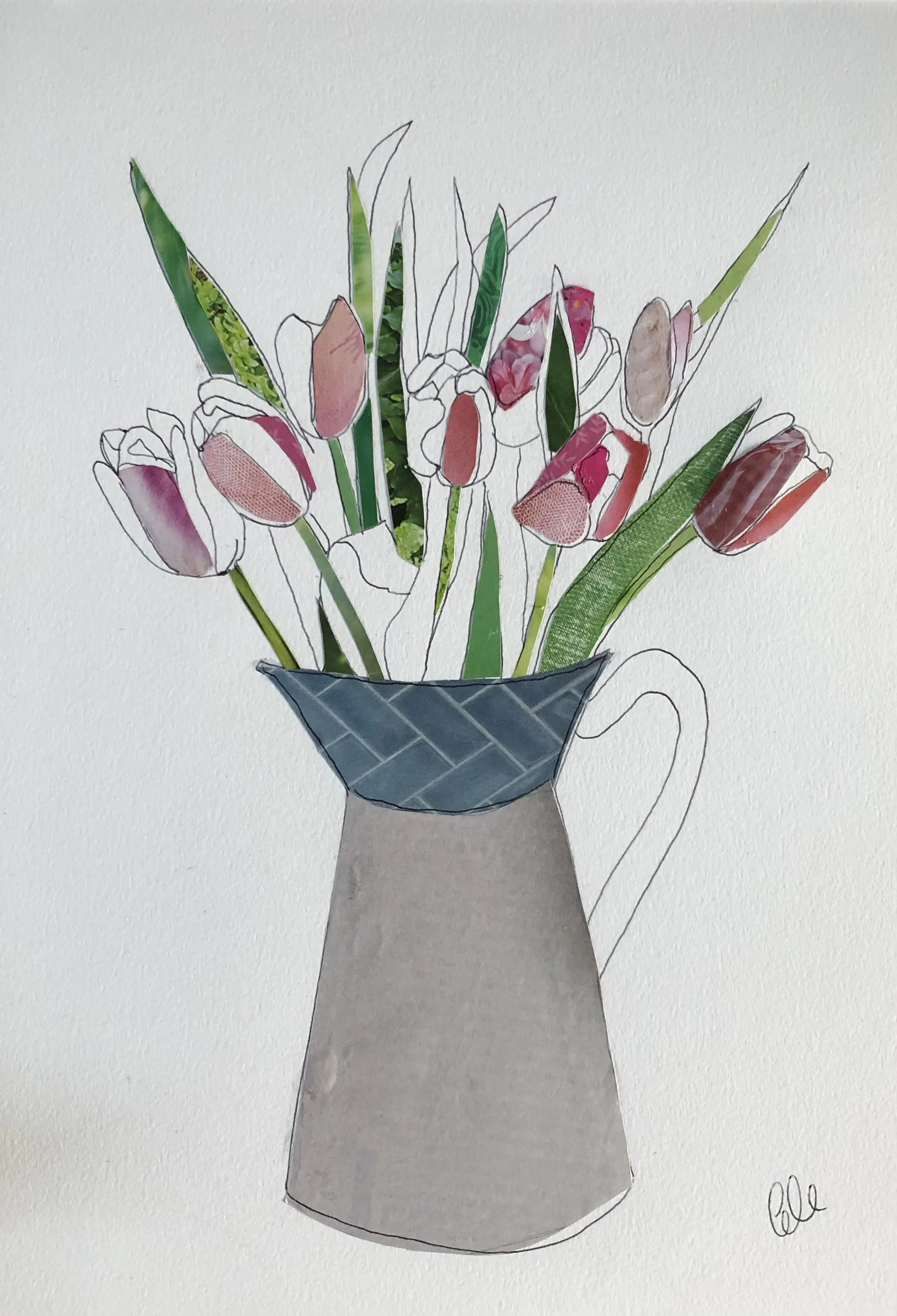 line drawings in various mediums including collage, monoprints and ink.