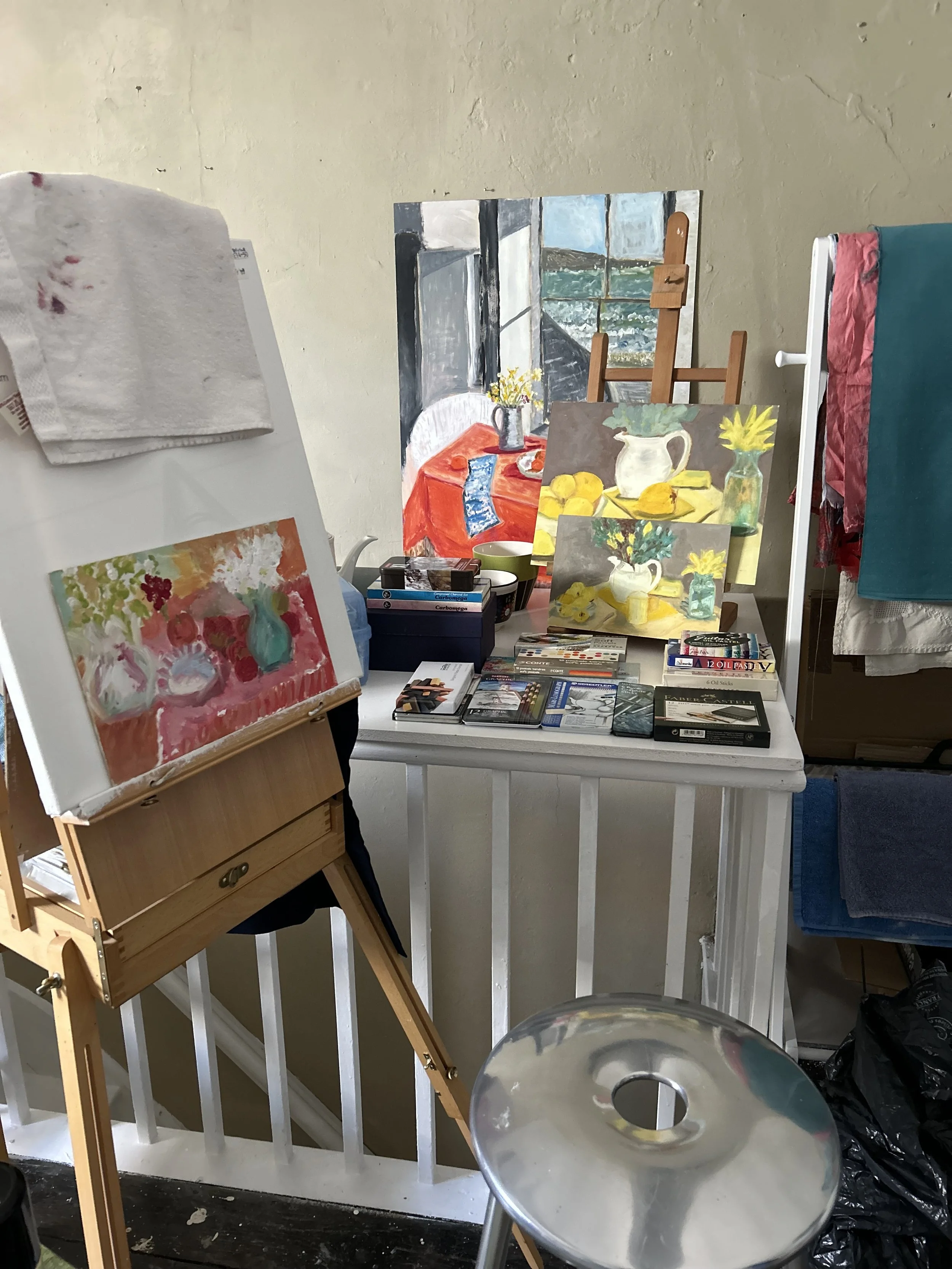 Landscapes and still life paintings in chalk paint water colour and acrylic.