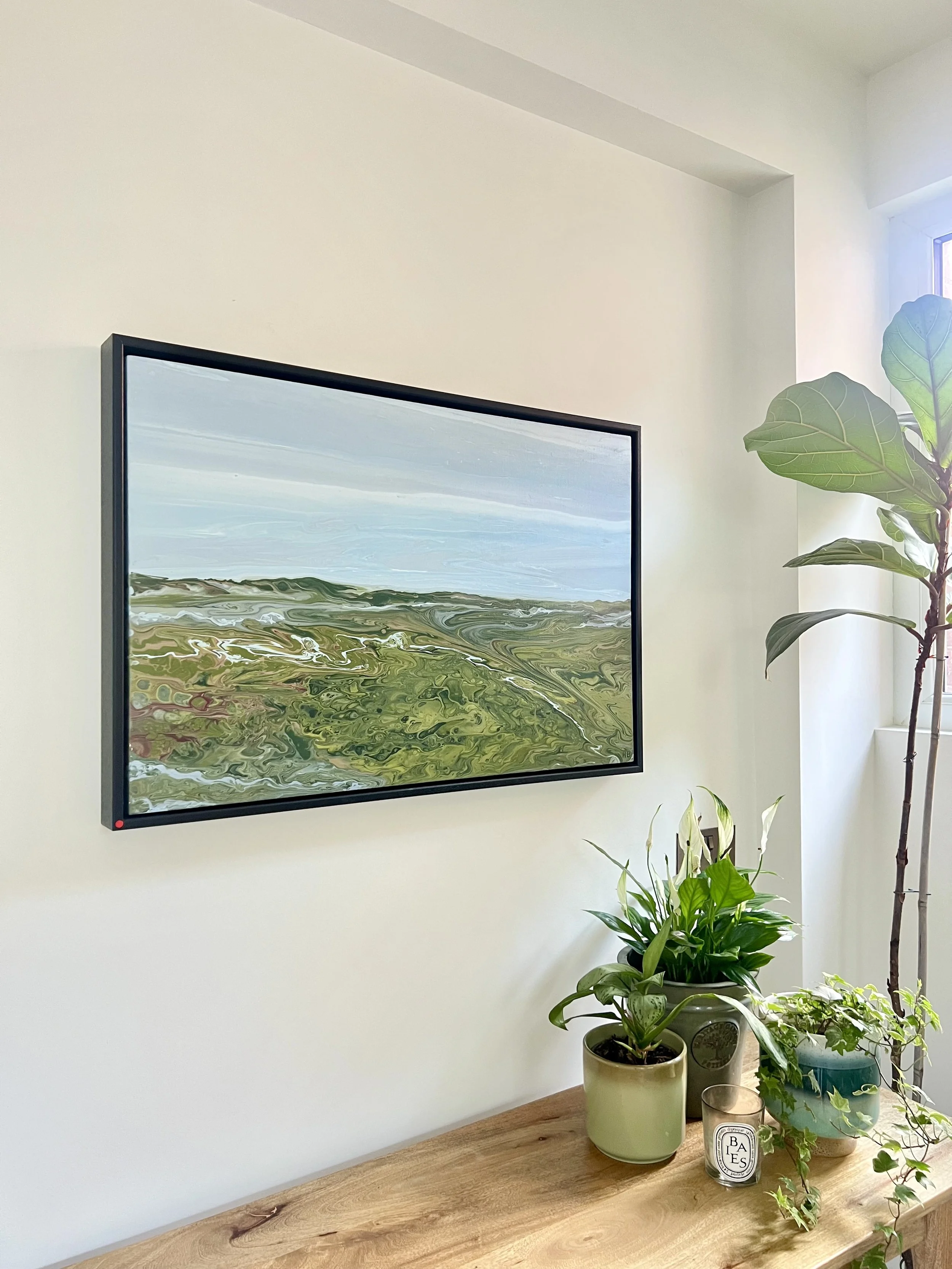 Poured landscapes and still life studies. Open Saturday only.